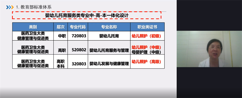 謝玉琳教授率先就新版《簡介》中中職“嬰幼兒托育”,高職“嬰幼兒托育服務與管理”,高職本科“嬰幼兒發展與健康管理”專業的職業面向、培養目標定位、主要專業課程與實習實訓作了詳細解讀。“1+X幼兒照護職業技能等級證書分初、中、高三個等級,涵蓋生活照料、安全防護、早期發展、特殊照護、入戶指導等模塊,與嬰幼兒托育相關專業相匹配,被列入了多個專業職業類證書舉例。”