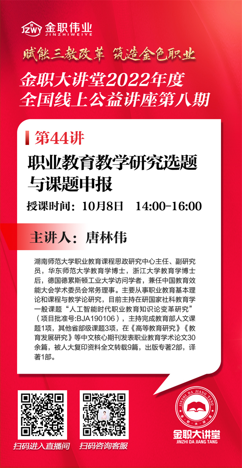 10月8日,金職大講堂將開啟第八期第44講,課程將邀請到湖南師范大學職業教育課程思政研究中心主任、副研究員就“職業教育教學研究選題與課題申報”進行主題授課。屆時,誠邀各位行業專家、院校老師共同參與、聆聽~。