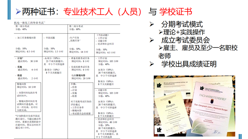 賀艷芳博士從教育主體、學習地點、教育計劃、教育法規、主管單位、課程設置、師資隊伍、證書考核等方面,全面、系統地闡述了德國雙元制教育的內核。所謂“雙元”,“一元”指職業學校,另“一元”指培訓企業。接受這種職業教育的學生要與培訓企業簽訂合同,部分時間在校學習理論知識,部分時間在企業當“學徒”,把課堂知識應用于實踐。