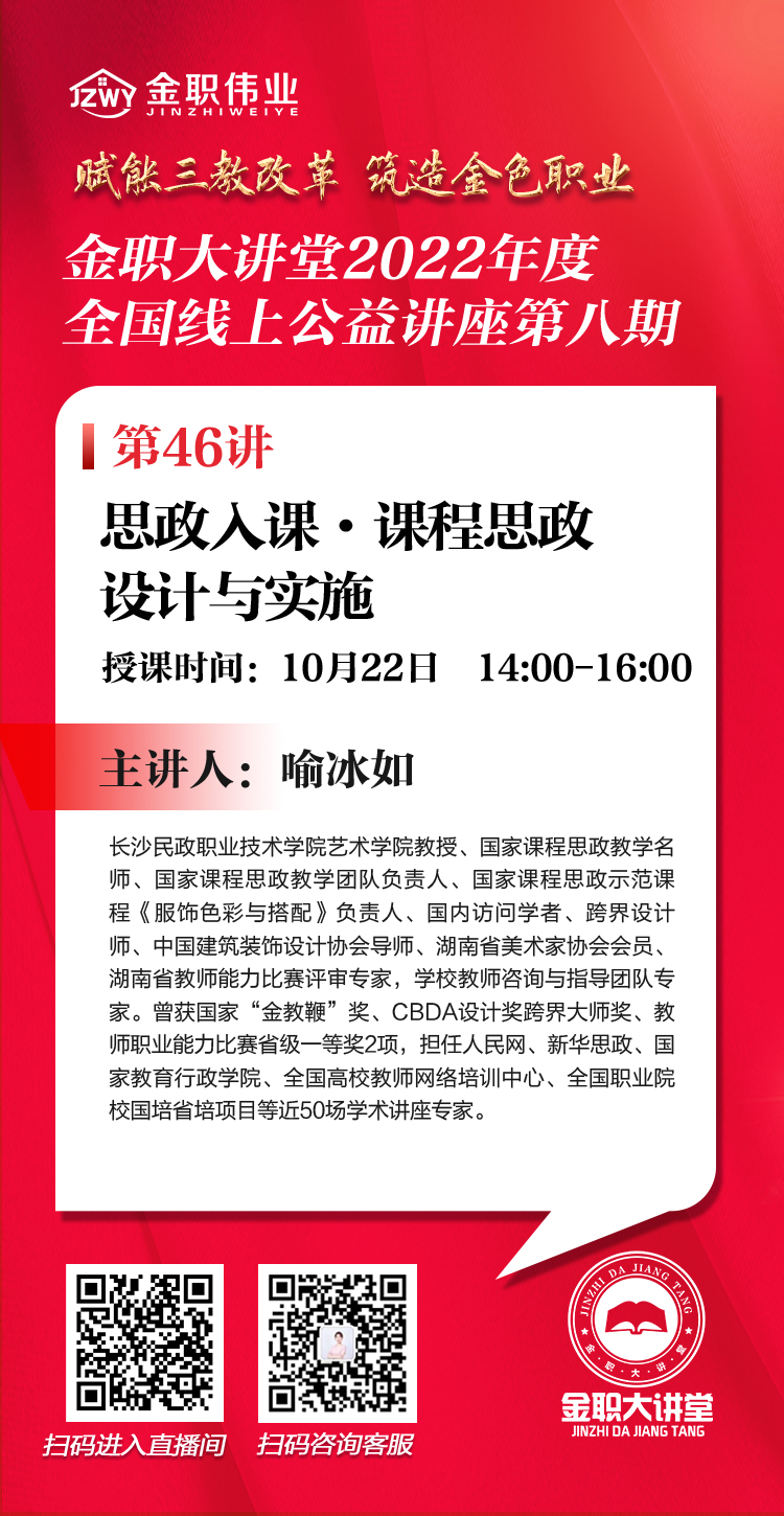 10月22日,“金職大講堂”將開啟第八期第46講,課程將邀請到國家課程思政教學名師、國家課程思政教學團隊負責人、長沙民政職業技術學院藝術學院喻冰如教授就“思政入課·課程思政設計與實施”進行主題授課。屆時,誠邀各位行業專家、院校老師共同參與、聆聽。