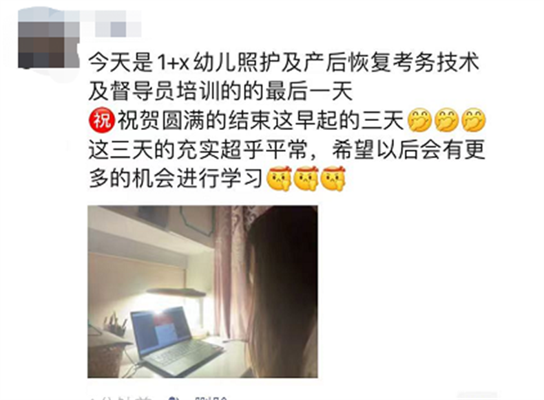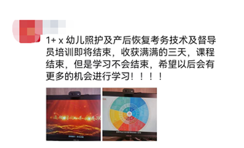 本次培訓集線上培訓和考核于一體,理論與實踐相統(tǒng)一,授課講師精心指導,語言生動形象,內容深入淺出,授課手段多樣,受到廣泛好評,為院校更好開展1+X幼兒照護、產后恢復職業(yè)技能等級證書試點工作夯實了基礎。