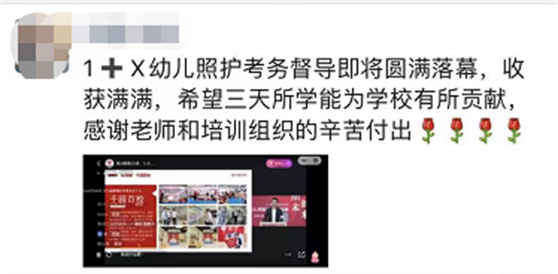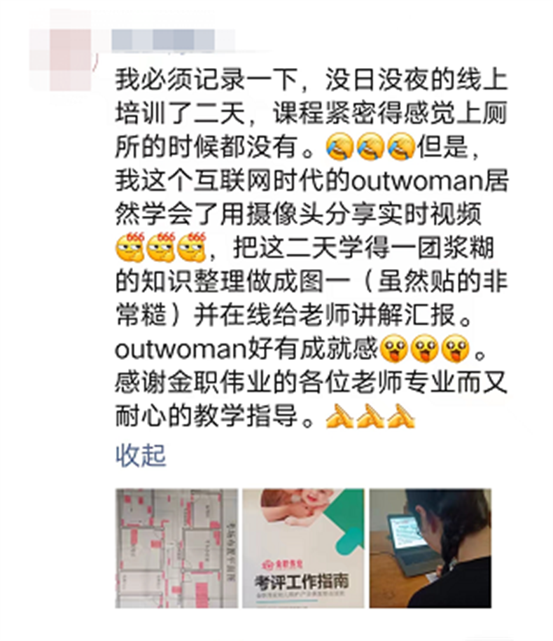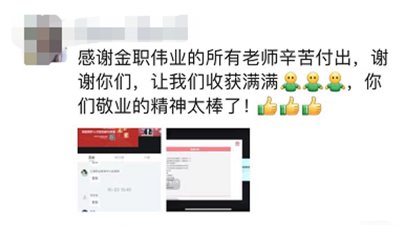 “非常感謝金職偉業(yè)的專家們全程用心的陪伴和專業(yè)授課,三天的學習安排緊湊而合理,滿滿的干貨,既有理論又有實操,讓我們度過了緊張而溫暖的線上學習之旅。”重慶市北碚職業(yè)教育中心教育與藝術產業(yè)部心理學專業(yè)宋梅歌老師表示,通過培訓,她明確了作為考務技術員和督導員的職責和使命,明白了托育行業(yè)發(fā)展是國家重點戰(zhàn)略任務,前景遠大,使命光榮。