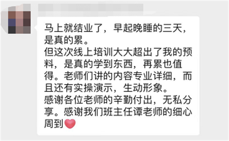 四川省筠連縣職業(yè)技術學校幼兒保育專業(yè)鄒倩老師提到,授課專家課程講解重點突出,通俗易懂,為參訓教師答疑解惑耐心細致,“在以后的工作中,我將學以致用,把所學的知識運用到以后的工作中,保質保量地完成考務、督導各項工作,以培養(yǎng)更多更優(yōu)秀的復合型技能人才,為我校發(fā)展注入新的活力。”