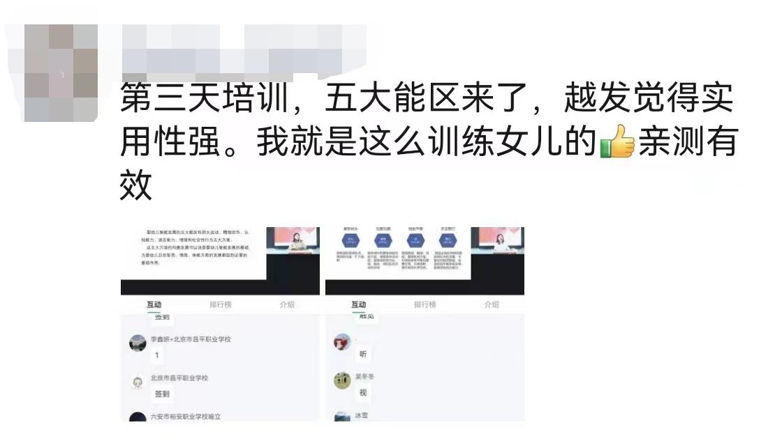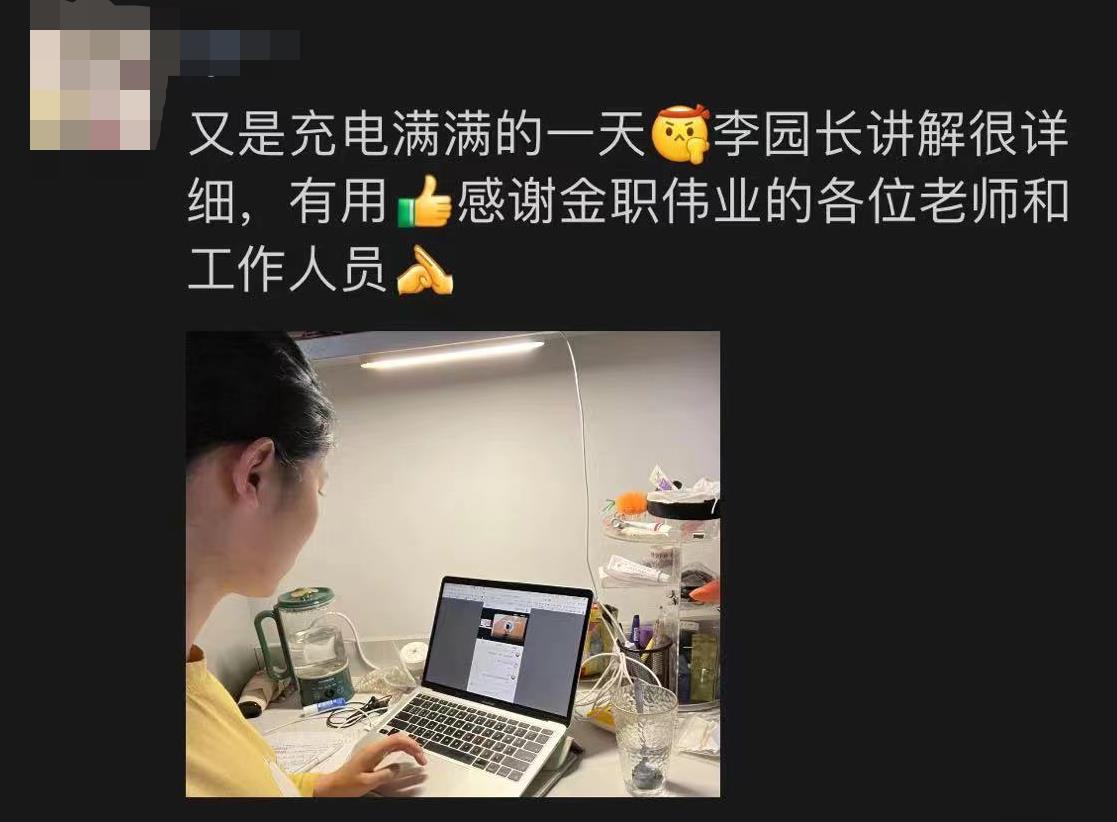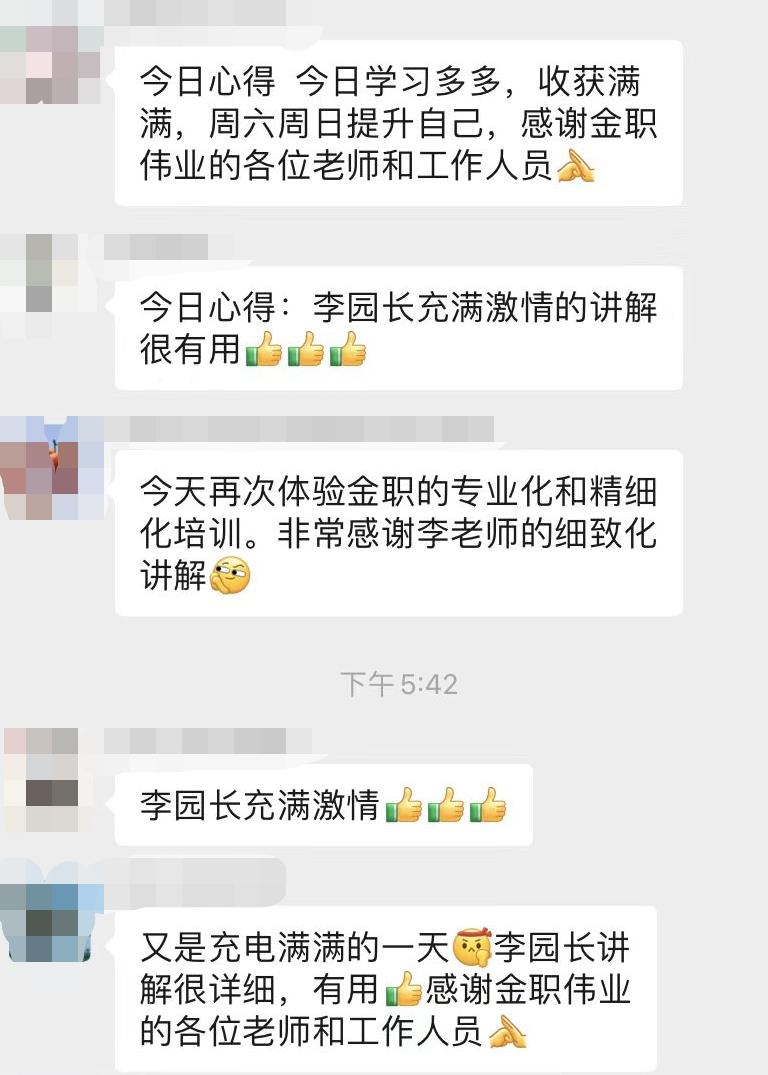 培訓過程中,所有參訓老師積極分享每日所學的新理論、新思路與學習感悟,在相互交流學習中,不斷充實提升自己專業水平。同時,為做好院校老師服務工作,金職偉業將參訓老師按區域分為12組,安排專職教學老師團隊、區域考評負責人團隊、會務團隊與班主任全天候在線,及時解答老師們的問題,獲得了參訓老師的一致好評。