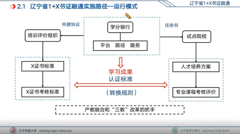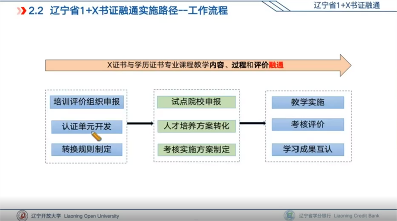 隨后,寧春主任就遼寧省1+X書證融通運行模式、工作流程進行了詳細講解。她提到,目前,遼寧省1+X書證融通工作主要以省教育部門為引導,由學分銀行提供支持和整體運行督導,培訓評價組織合作,最終由試點院校進行方案的修訂、完善,通過多方協作來共同實施。“在實施的過程中,還需以一個認證標準為基準,緊緊圍繞其為中心,開展各項工作。”