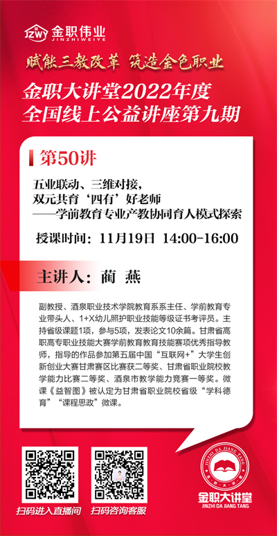 11月19日,“金職大講堂”將開啟第九期第50講,課程將邀請酒泉職業技術學院教育系系主任、學前教育專業帶頭人藺燕就“五業聯動、三維對接,雙元共育‘四有’好老師——學前教育專業產教協同育人模式探索”進行主題授課。屆時,誠邀各位行業專家、院校老師共同參與。