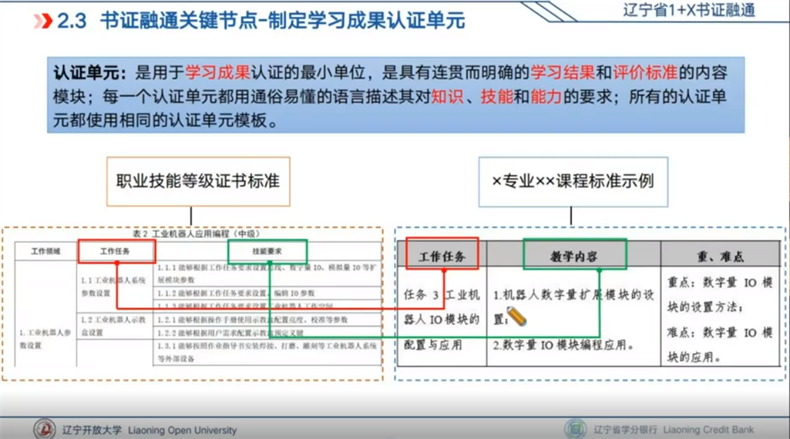 寧春主任強調,書證融通有兩個關鍵節點:其一,制定學習成果認定單元。即用于學習成果認證的最小單位,是具有連貫而明確的學習結果和評價標準的內容模塊。每一個認證單元都用通俗易懂的語言描述其對知識、技能和能力的要求;其二,組建專家團隊。專家團隊成員原則上數量為5-7人,需包含證書標準專家、行業專家、教學專家。