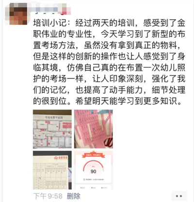 “本次線上學(xué)習(xí),既有觀念上的洗禮,也有理論上的提高;既有知識(shí)上的沉淀,也有教學(xué)技藝上的增長(zhǎng)。”安徽中醫(yī)藥高等專科學(xué)校護(hù)理系護(hù)理專業(yè)實(shí)驗(yàn)員李葉老師表示,作為一名教師,她將把這份專業(yè)和責(zé)任心傳播下去,為我國(guó)教育事業(yè)的發(fā)展添磚加瓦,為幼兒照護(hù)人才培養(yǎng)貢獻(xiàn)更多力量。南寧市西鄉(xiāng)塘區(qū)紅十字會(huì)一級(jí)主任科員何卓姿老師談道,經(jīng)過(guò)此次培訓(xùn),她深切地感受到了金職偉業(yè)的專業(yè)能力,“在有視頻、有文字、有理論、有實(shí)踐的生動(dòng)課堂中,我們?nèi)w參訓(xùn)教師積極參與、認(rèn)真領(lǐng)悟,真心收獲滿滿。”