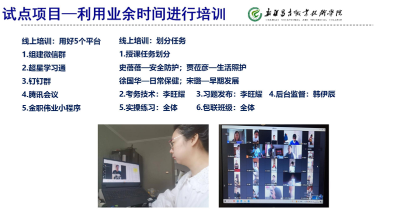 在學生培訓方面,賈蒞彥副教授表示應從以下五個方面入手:首先,編制教學材料,建設校內題庫。其次,研究實訓項目,細化實操標準。然后,由專人負責,積極購買實訓用物。再者,采用混合式學習模式與三段遞進培訓流程,利用業余時間對學生進行培訓。第一階段為線上學習自練自查:利用泛亞教學平臺及自主開發的1+X精品課程資源,學生自主學習,結合線上視頻資料,了解操作流程,熟記操作中的語言復述內容,同時進行線上理論刷題;第二階段為線下集中指導:先教師講解并示范幼兒照護的相關技能,再由學生進行實際操作練習。第三階段為分組輔導練習,以強化操作要點。最后,階段性進行理論和實操考核。