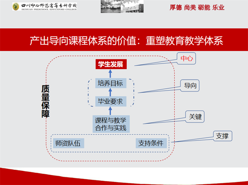 秦莉教授提到,成果導向教育理念在于教學設計和教學實施的目標,是學生通過教育過程最后所取得的學習成果。它強調四個問題:是什么、為什么、如何幫助、如何知道;強調四個實施原則:清楚聚焦、擴大機會、提高期待、反向設計;五個實施要點:確定學習成果、構建課程體系、確定教學策略、自我參照評價、逐級達到頂峰。