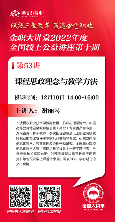12月10日,金職大講堂將開啟第十期第53講,課程將邀請長沙民政職業技術學院謝麗琴副教授就“課程思政理念與教學方法”進行主題授課。屆時,誠邀各位行業專家、院校老師共同參與。