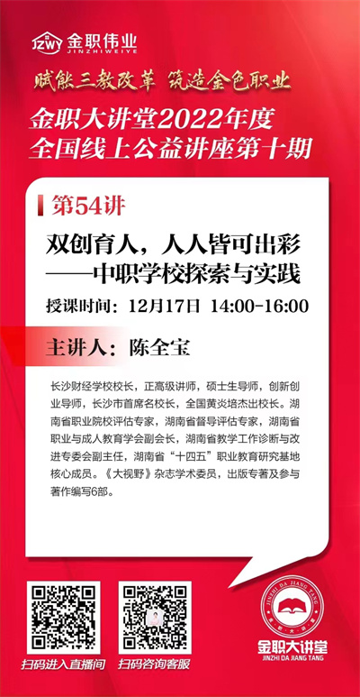 12月17日,“金職大講堂”將開啟第十期第54講,課程將邀請長沙財經學校陳全寶校長就“雙創育人,人人皆可出彩——中職學校探索與實踐”進行主題授課。屆時,誠邀各位行業專家、院校老師共同參與。