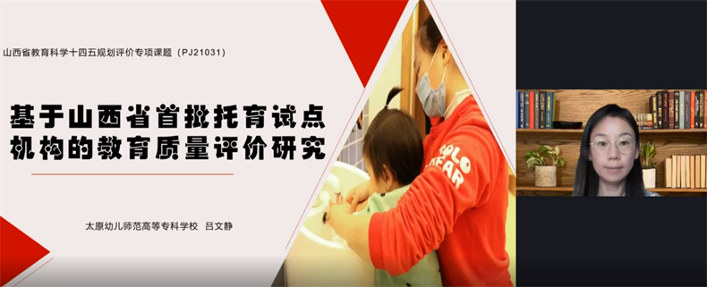隨后,呂文靜副教授緊緊圍繞此次山西省首批托育試點機構的教育質量評價研究,就研究的背景、思路、方法、過程、成果作了分享,并對托育機構服務范圍、托育機構師幼比、托育機構運營情況、托育機構安全防護制度現狀等研究數據作了詳細展示。