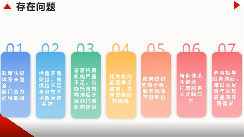 基于此次研究,呂文靜副教授認為,目前托育行業發展存在以下七點問題:一政策法規體系未健全,部門合力尚待加強;二供需矛盾突出,總供給不足與分布不平衡問題并存;三普惠托育機構嚴重不足,公辦托育機構滯后于民辦托育機構建設;四托育機構運營舉步維艱,生存發展比較困難;五政府提供支持不夠,服務保障不夠到位;六培訓體系不健全,托育服務人才缺口大;七養育指導滯后,難以滿足青年父母高品質養育需求。