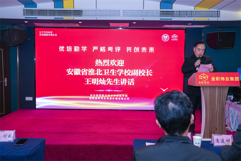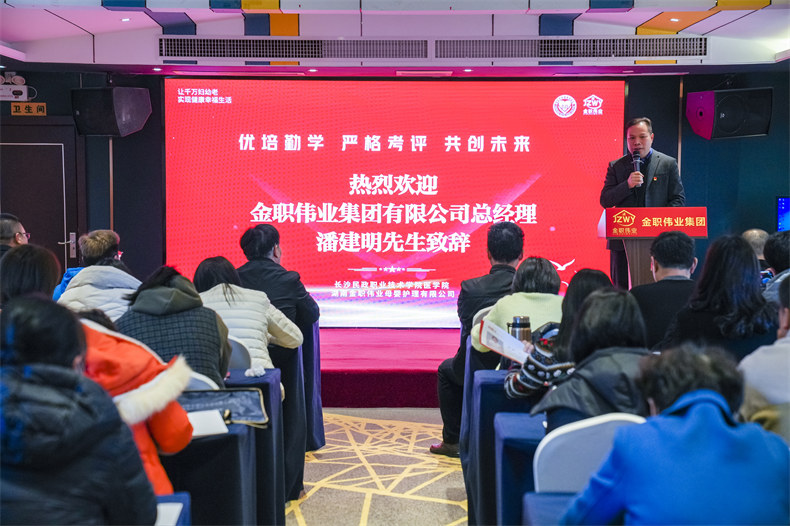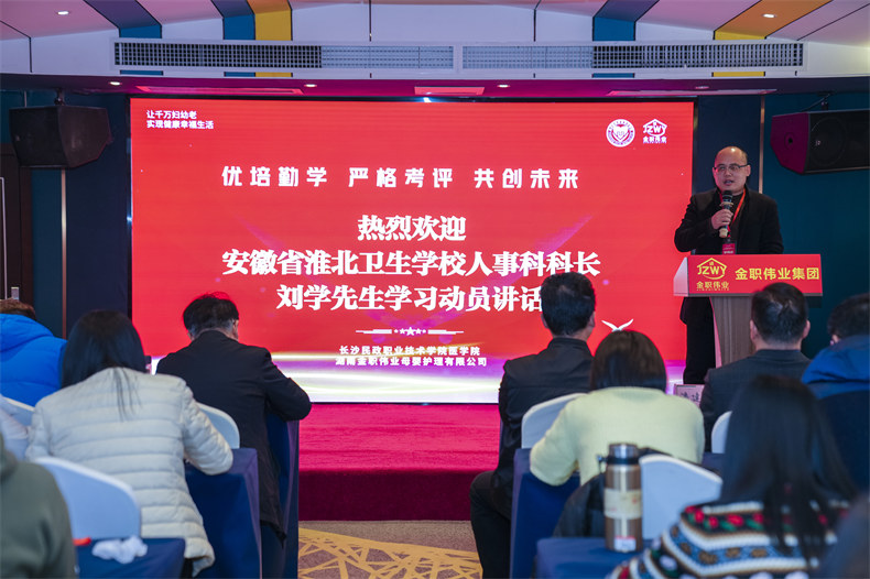 典禮上,金職偉業總經理潘建明率先進行致辭,“非常感謝各位領導、專家、老師們,能在新春時節來長沙參加培訓,這不僅是對金職偉業的支持,更是信任。”潘建明提到,在推進“崗課賽證”綜合育人模式下,2022年金職偉業也取得了系列成果:一,證崗對接上,持續升級證書標準,推動教學標準與行業崗位標準融通;與國家和地方的行業主管部門對接,賦能職后從業人員提升,長沙市、鄭州市等地已將1+X幼兒照護職業技能等級證書納入托育從業人員的準入范疇;推動“千園百校”工程,搭建人才供給側和需求側對接平臺,賦能持證學生對口上崗;征集實習就業典型案例,講好技能人才成長故事。二,書證融通上,牽頭開發護理、助產專業群核心專業課證融通教學資源,著力推進嬰幼兒托育專業群、嬰幼兒托育服務與管理專業群課證融通課程資源的建設,同時金職偉業作為核心單位完成的職業教育助產專業(群)資源庫,已順利通過教育部驗收。三,賽證融通上,金職偉業作為技術支持單位或承辦單位,分別支持了湖南省、寧夏自治區、山東省、四川省、貴州省、陜西省、河南省等省份或地市的幼兒照護相關賽項。四,書證融通上,金職偉業向職業教育國家學分銀行提供了1+X幼兒照護、產后恢復職業技能等級證書的建議學分,證書學習成果獲國家學分銀行認定,同時與遼寧省、北京市開放大學及1+X推進辦合作,積極推動幼兒照護、產后恢復職業技能等級證書書證融通落地。