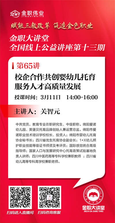 3月11日,金職大講堂將開啟第65講,課程將邀請陽愛諾幼兒園、英堡貝托育品牌創始人兼運營總監關智元老師,以“校企合作共創嬰幼兒托育服務人才高質量發展”為主題進行授課。屆時,誠邀各位行業專家、院校老師共同參與。