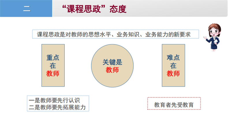 “課程思政”是對教師的思想水平、業務知識、業務能力的新要求,其實施重點、關鍵、難點均在教師。左春雨教授認為,廣大教師應扎根講臺,圍繞課程本源謀劃改革,將專業知識與思想政治教育內容有機結合,從課程觀到專業觀、職業觀,逐步做深、做實、做透,努力回答好“立德樹人”的根本問題,讓專業內容更具深度、讓課堂氛圍更有溫度、讓思政教育更有力度。