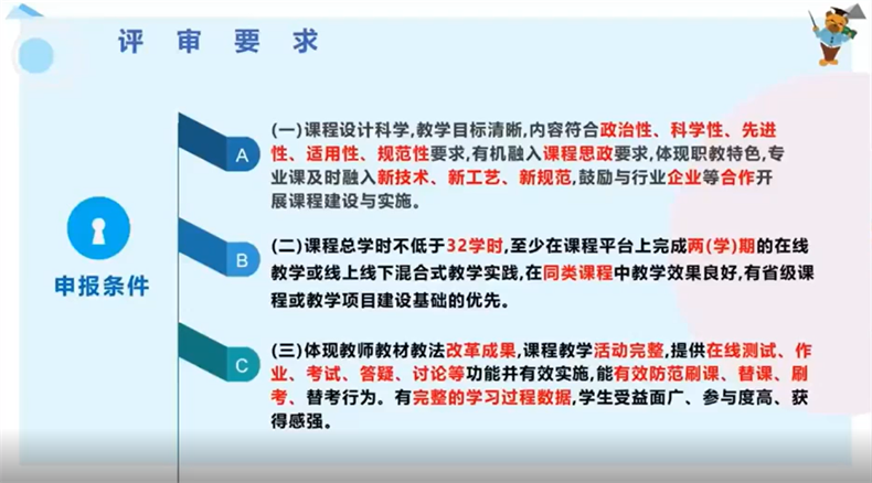 隨后,崔萱副教授從課程申報(bào)過(guò)程、指標(biāo)研讀、申報(bào)材料、課程概述入手,對(duì)申報(bào)中需要注意的事項(xiàng)作了詳細(xì)說(shuō)明。“申報(bào)的課程應(yīng)體現(xiàn)教師、教材、教法改革成果,課程教學(xué)活動(dòng)完整,提供在線測(cè)試、作業(yè)、考試、答疑、討論等功能井有效實(shí)施,能有效防范刷課、替課、刷考、替考行為。有完整的學(xué)習(xí)過(guò)程數(shù)據(jù),學(xué)生受益面廣、參與度高、獲得感強(qiáng)。”