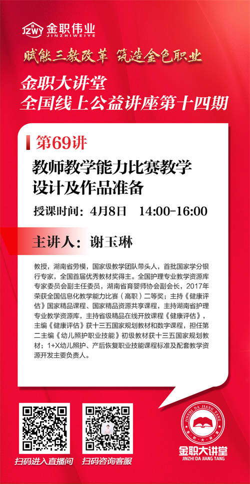 3月8日,金職大講堂將開啟第69講,課程將邀請(qǐng)?jiān)乐萋殬I(yè)技術(shù)學(xué)院護(hù)理學(xué)院院長(zhǎng)謝玉琳教授,以“教師教學(xué)能力比賽教學(xué)設(shè)計(jì)及作品準(zhǔn)備”為主題進(jìn)行授課。屆時(shí),誠(chéng)邀各位行業(yè)專家、院校老師共同參與。