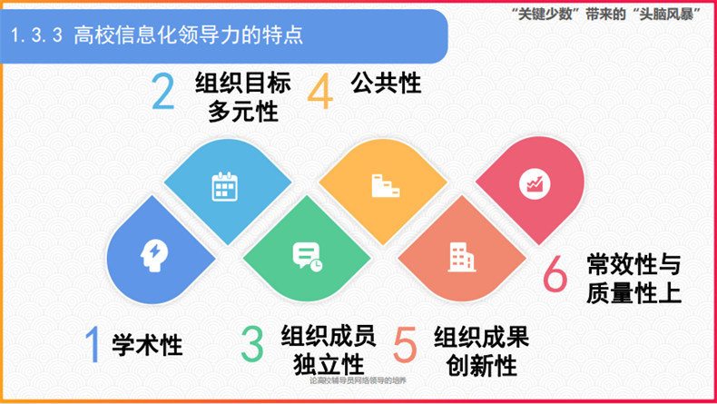 信息化領(lǐng)導(dǎo)力是指在信息化的背景下,領(lǐng)導(dǎo)者利用信息技術(shù)吸引和影響被領(lǐng)導(dǎo)者與利益相關(guān)者,并持續(xù)實現(xiàn)群體或組織目標(biāo)的能力。張弛老師提到,高校信息化領(lǐng)導(dǎo)力具有學(xué)術(shù)性、組織目標(biāo)多元性、組織成員獨立性、公共性、組織成果創(chuàng)新性、常效性與質(zhì)量性等特點。