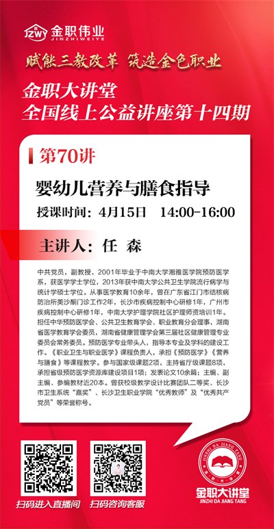 4月15日,金職大講堂將開啟第70講,課程將邀請長沙衛(wèi)生職業(yè)學(xué)院任森副教授,以“嬰幼兒營養(yǎng)與膳食指導(dǎo)”為主題進行授課。屆時,誠邀各位行業(yè)專家、院校老師共同參與。