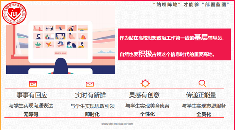 隨后,張弛老師用一個個實際案例,對如何提升高校輔導(dǎo)員網(wǎng)絡(luò)領(lǐng)導(dǎo)力作了詳細(xì)說明。“作為站在高校思想政治工作第一線的基層輔導(dǎo)員,自然也要積極占領(lǐng)這個信息時代的重要高地。”張弛老師認(rèn)為輔導(dǎo)員應(yīng)關(guān)注網(wǎng)絡(luò),加強學(xué)生文化素質(zhì)教育和自律教育,同時建立專門平臺,利用網(wǎng)絡(luò)手段加強德育教育,最后要培養(yǎng)運用網(wǎng)絡(luò)從事教育工作的專業(yè)隊伍。