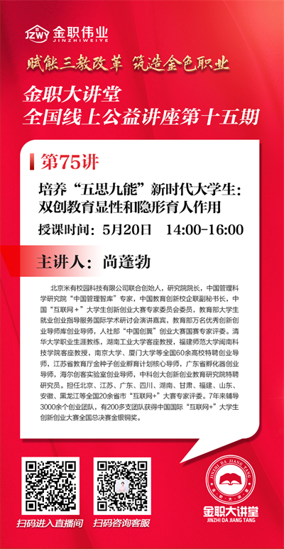 5月20日,金職大講堂將開啟第十五期第75講,課程將邀請北京米有校園科技有限公司聯合創始人尚蓬勃先生,進行《培養“五思九能”新時代大學生:雙創教育顯性和隱形育人作用》主題授課。屆時,誠邀各位行業專家、院校老師共同參與。
