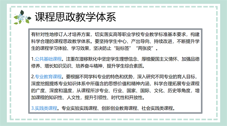 隨后,寇教授就課程思政的主要內容,公共基礎、專業教育、實踐類課程思政內容體系的建設進行了詳細解讀。她提到,“教師應該聚焦專業特點,有針對性地修訂人才培養方案,切實落實高等職業學校專業教學標準基本要求,構建科學合理而又有特色的課程思政教學體系,要堅持以學生中心,不斷提升學生的課程學習體驗、學習效果。”