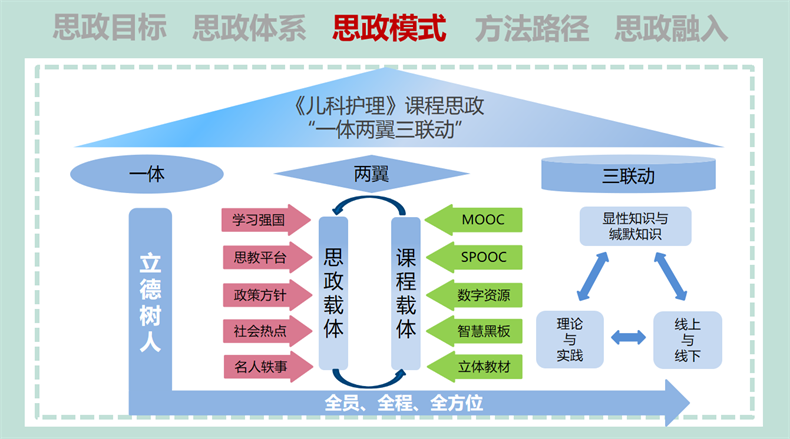 提到課程思政的實踐展示時,寇教授表示,可以結合“辦學定位、專業特色、人才培養要求”,確定“一條主線,八個重點”的課程思政建設目標??芙淌谶€以《兒科護理》課程為主體,以“一體兩翼三聯動”為要點,對課程思政的思政模式、方法路徑、思政融入進行了舉例說明。