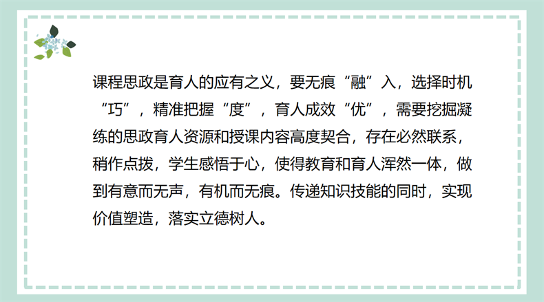 寇教授提到,全面推進課程思政建設是落實立德樹人根本任務的戰略舉措,也是提高人才培養質量的重要任務。她強調,只有科學設計課程思政教學體系,結合專業特點分類推進課程思政建設,將課程思政融入課堂教學建設全過程,才能最高效發揮課程思政育人作用。