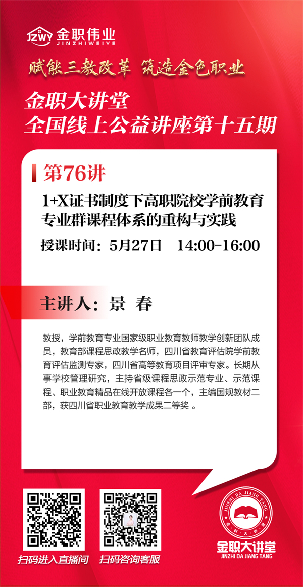 5月27日,金職大講堂將開啟第十五期第76講,課程將邀請四川幼兒師范高等專科學校景春教授,進行《1+X證書制度下高職院校學前教育專業(yè)群課程體系的重構與實踐》主題授課。屆時,誠邀各位行業(yè)專家、院校老師共同參與。