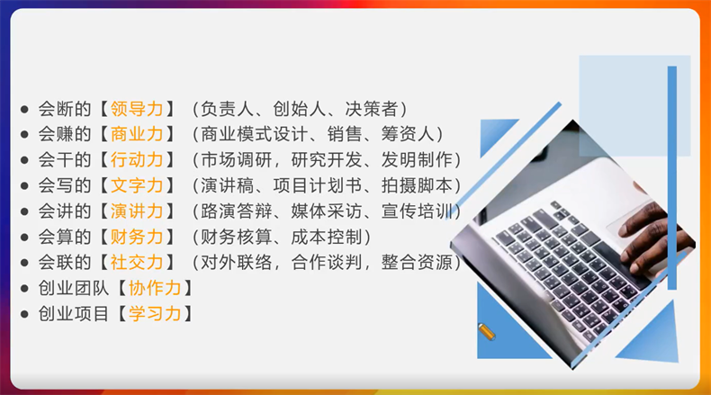 隨后,尚蓬勃老師就雙創(chuàng)教育的顯性育人作用的九種能力做了說明,即會斷的領導力、會賺的商業(yè)力、會干的行動力、會寫的文字力、會講的演講力、會算的財務力、會聯(lián)的社交力、創(chuàng)業(yè)團隊協(xié)作力及創(chuàng)業(yè)項目學習力。