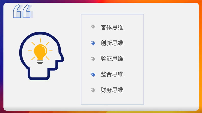 “雙創(chuàng)教育的隱性育人作用在于能培養(yǎng)學生的客體思維、創(chuàng)新思維、驗證思維、整合思維與財務思維。客體思維的關鍵在‘同’,忘掉自己,以對方的角度、思維、眼光思考問題,更容易幫大家看清某件事物的本質;創(chuàng)新思維關鍵在‘變’,掌握主動性,不滿足當下解決方案,不斷超越不斷創(chuàng)新;驗證思維的關鍵在‘試’,實踐出真相,不停留在計劃階段,不斷試錯以找到最優(yōu)解;整合思維的關鍵在于‘借’,跨界合作,聚合團隊,共享資源實現(xiàn)共贏;財務思維的關鍵在于‘算’,做任何事前先學會計算一件事的投入產(chǎn)出比(ROI),才能讓將事情做對做好。”