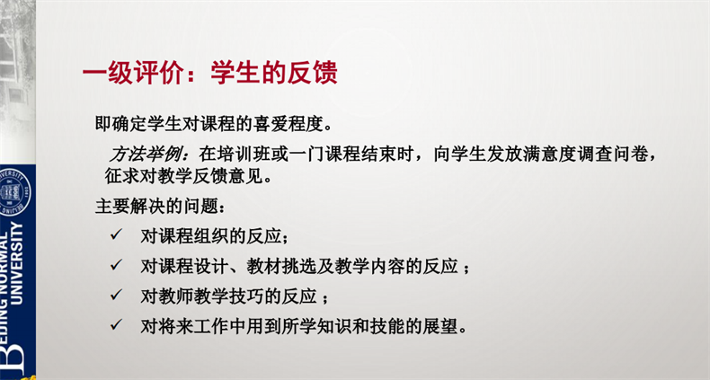職業教育是賦予學習者從事某種職業性工作所需能力的教育,其學業評價必須考慮教學內容與職業活動之間的緊密聯系,因此,職業教育學業評價的對象不僅包括學習收獲,也涉及學習者在企業工作中的績效水平。對此,趙志群教授詳細講解了經典的職業教育學業評價模型:柯氏評價。其圍繞培訓過程中的反應、學習、行為和結果四方面,確定了職業教育學業評價的四個基本層次:一級評價:學生(員)的反饋,課程結束時進行學生滿意度調查;二級評價:學習效果,通過學習過程記錄、學習結果測試等方式對課程目標的達成情況進行確認;三級評價:行為變化的程度,在學習結束一段時間后進行,確定學習者行為轉變的程度;四級評價:產生的效果,調查學習者因參加教育培訓后實現的最終結果,如對口就業率調查和畢業生發展跟蹤調查。