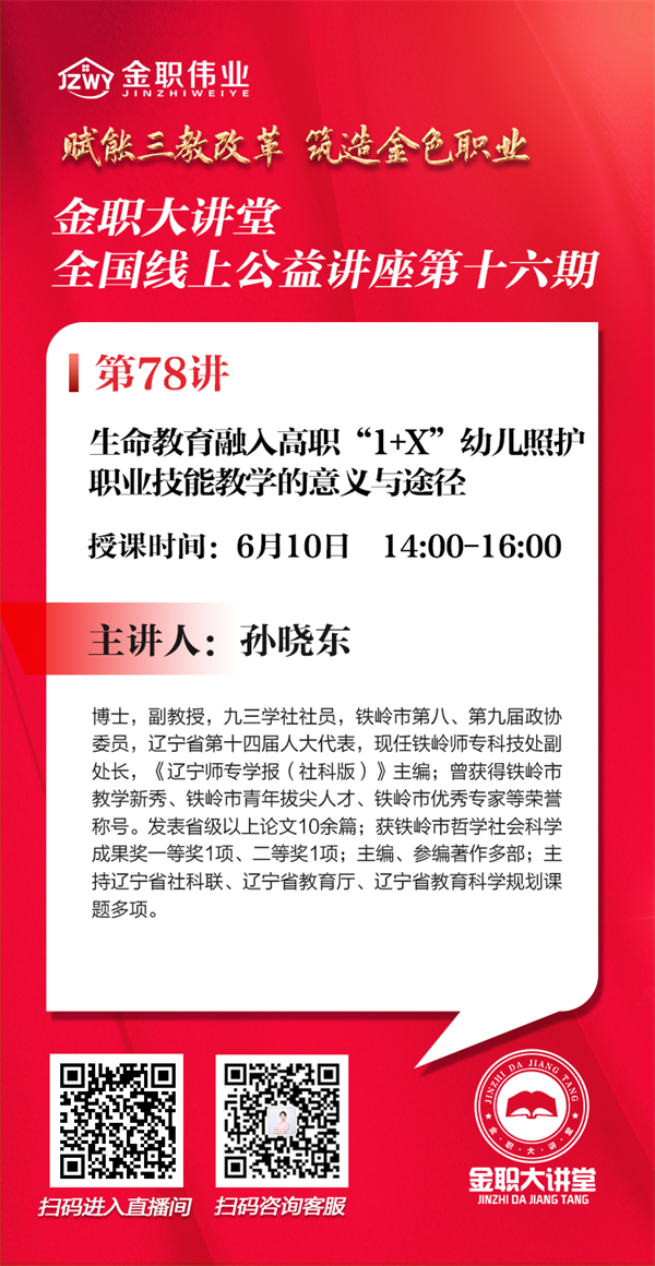 6月10日,金職大講堂將開啟第十六期第78講,課程將邀請鐵嶺師范高等專科學校孫曉東副教授,進行《生命教育融入高職“1+X”幼兒照護職業技能教學的意義與途徑》主題授課。屆時,誠邀各位行業專家、院校老師共同參與。