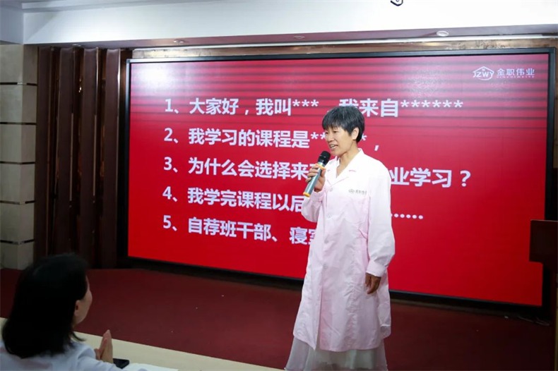 典禮伊始,金職偉業招生招商事業部副總監涂霞作開班致辭,為學員們分析了市場需求,“90后已經成為生育主力軍,她們更注重時間成本和消費體驗,對掌握了護理、營養、心理等相關知識的綜合性技能的月嫂需求很大。”她鼓勵學員們學好技能,為客戶家庭帶去便利和幸福,也給自己帶來價值感和成就感。