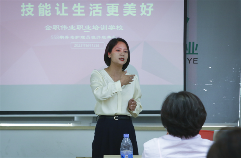 蔣琴老師為學員們作開班寄語,“能夠在金職偉業相聚,足以證明我們是一群志同道合的人,希望大家放下心中的雜念和顧慮,全身心的投入到學習中來。”她期待學員們把課堂的系統知識變成自己的知識,用科學、專業的知識技能來投入到養老護理工作中。