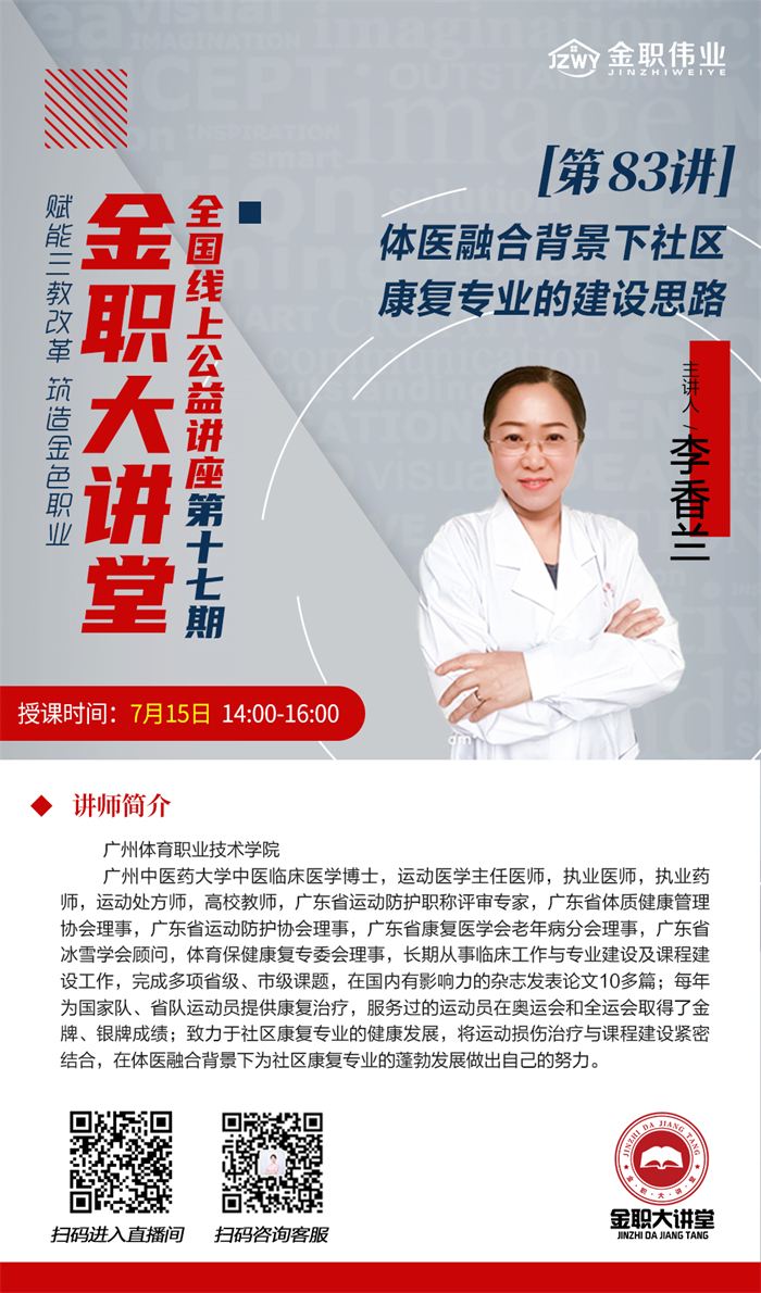 7月15日,金職大講堂將開啟第十六期第83講,課程將邀請廣州體育職業(yè)技術學院李香蘭博士,進行《體醫(yī)融合背景下社區(qū)康復專業(yè)的建設思路》主題授課。屆時,誠邀各位行業(yè)專家、院校老師共同參與。
