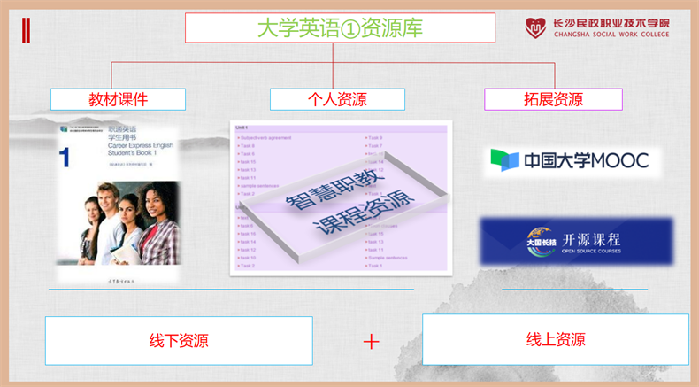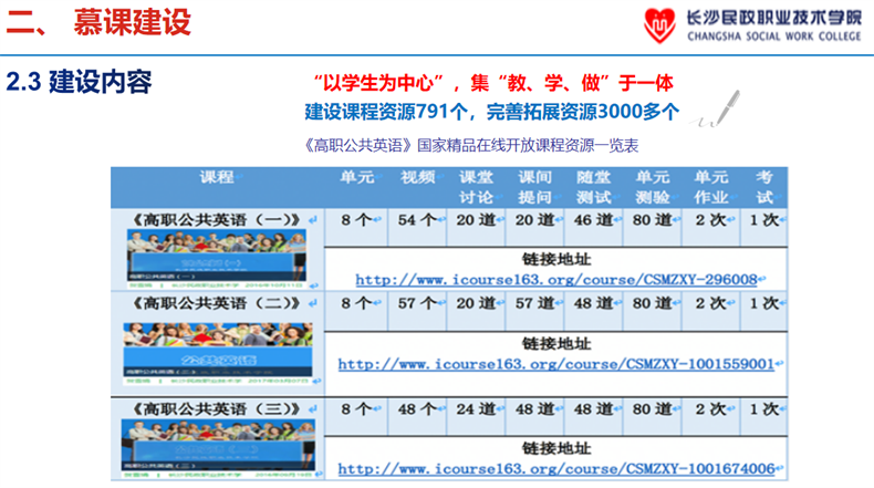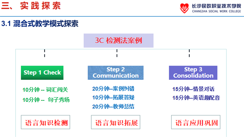 “在線課程資源的建設與應用,是當前職業(yè)院校內涵建設的重要抓手,也是提高人才培養(yǎng)質量的重要途徑。如何利用‘互聯(lián)網+’等現代信息技術,促進職業(yè)教育資源共享,推動教學方式方法改革,是我們職業(yè)院校一直思考的問題。”此次課程分為兩部分,金釧主任聚焦長沙民政職業(yè)技術學院國家級精品開放課程《高職公共英語》的建設與應用情況,詳細講解了教學資源融入現代信息技術的一體化建設路徑,胡兵老師則作了3C檢測法課堂教學展示。