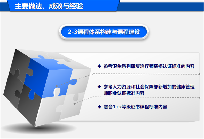隨后,李香蘭老師就社區康復專業課程體系構建、師資隊伍建設、教學團隊建設、實踐條件建設、人才培養途徑探索、教學管理與質量評價制度建設、社會服務能力建設等方面展開介紹。她提到,要以職業活動為主體,通過融合1+X證書課程標準內容進行課程改革,形成模塊化課程體系;充分發揮校企協同育人優勢,借助一線資源,開展校內外綜合實訓;以專業群方式高質量發展專業,夯實學生未來發展。