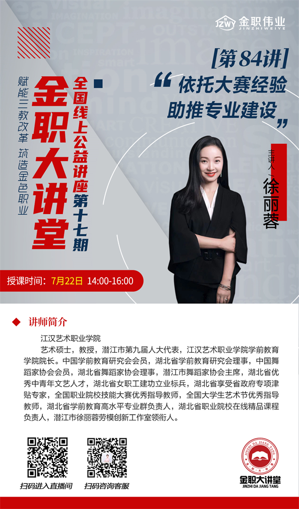 7月22日,金職大講堂將開啟第十六期第84講,課程將邀請江漢藝術職業學院徐麗蓉教授,進行《依托大賽經驗,助推專業建設》主題授課。屆時,誠邀各位行業專家、院校老師共同參與。