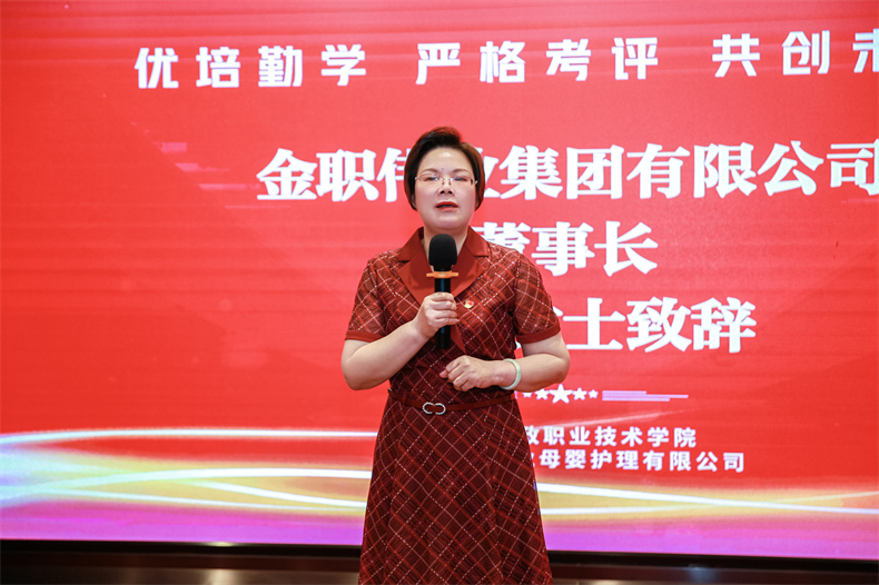 典禮伊始,金職偉業董事長彭英發表講話,她表示,金職偉業的發展壯大離不開國家和各位專家、老師的大力支持。大家的熱情參與推動了金職偉業的進一步發展。她期待,此次培訓后各位專家、老師能夠繼續支持金職偉業1+X幼兒照護及產后恢復證書的推廣工作,促進1+X證書知名度的提高,吸引更多優秀人才加入到落實1+X證書制度試點工作中來。