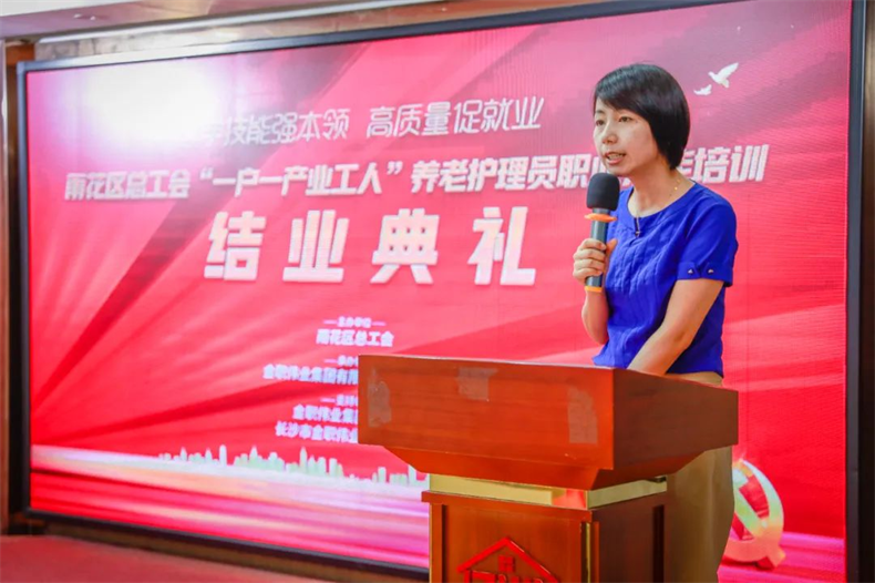 隨后,雨花區總工會副主席廖莎對金職偉業全力推進培訓表示誠摯的謝意,對在座學員順利結業表示熱烈的祝賀。她談到,“養老服務供需缺口巨大,是服務夕陽人群的朝陽產業,養老護理員將成為稀缺人才。”對于即將走上工作崗位的學員們,她表示,培訓結束不是終點,而是新職業的起點,廖莎希望大家持續學習,不斷成長,將專業技能打造成核心競爭力,提升自信,強化責任,做一個善良有溫度的人。