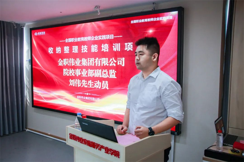 為深入貫徹黨的二十大精神,深化產教融合、校企合作,進一步推進“雙師型”教師隊伍高質量建設,7月26日,2023年職業教育教師企業實踐項目——收納整理技能培訓項目實踐,在第二批全國職業教育教師企業實踐基地——金職偉業集團有限公司正式啟動。原湖南女子學院家政系系主任、湖南省整理收納專項職業能力開發專家梁小燕,河北化工醫藥職業技術學院王柯靜和金職偉業院校事業部副總監劉偉出席此次開班典禮。