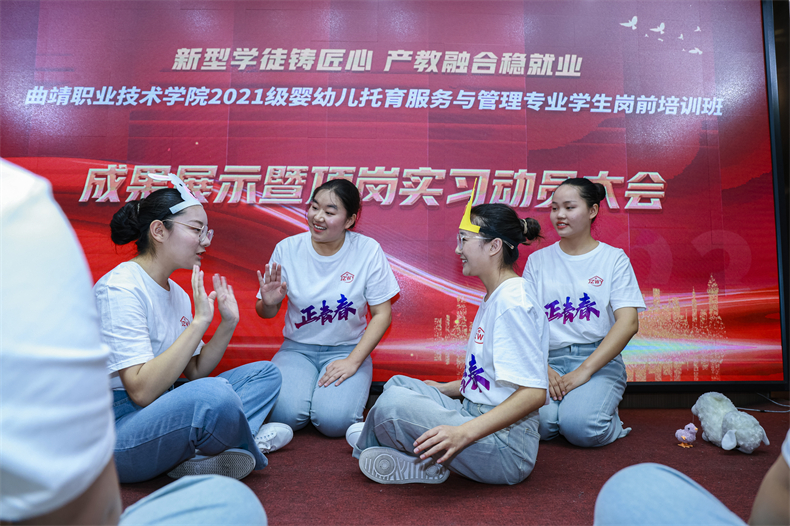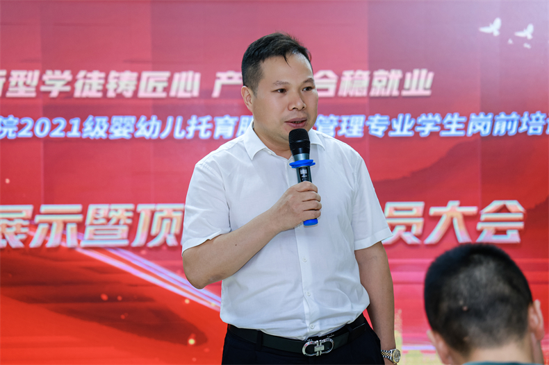 為切實做好學生頂崗實習工作,驗收崗前培訓成果,7月29日,曲靖職業技術學院2021級嬰幼兒托育服務與管理專業學生崗前培訓成果大會暨頂崗實習動員大會順利舉行。此次學生崗前培訓及頂崗實習是金職偉業集團有限公司(以下簡稱“金職偉業”)和曲靖職業技術學院深化產教融合、校企合作,深入推進校企雙主體育人,強化現代學徒制人才培養,助力高質量就業的有力實踐。湖南可優比托育服務有限公司創始人、總園長龔治宇,湖南省育嬰師協會會長、金職偉業總經理潘建明,院校事業部總監周該生出席活動并講話。