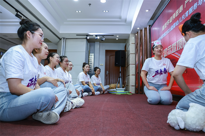 現場,經過崗前培訓的學生以組為單位,從語言活動、精細動作、認知活動等方面,對15天的崗前培訓成果進行匯報展示。