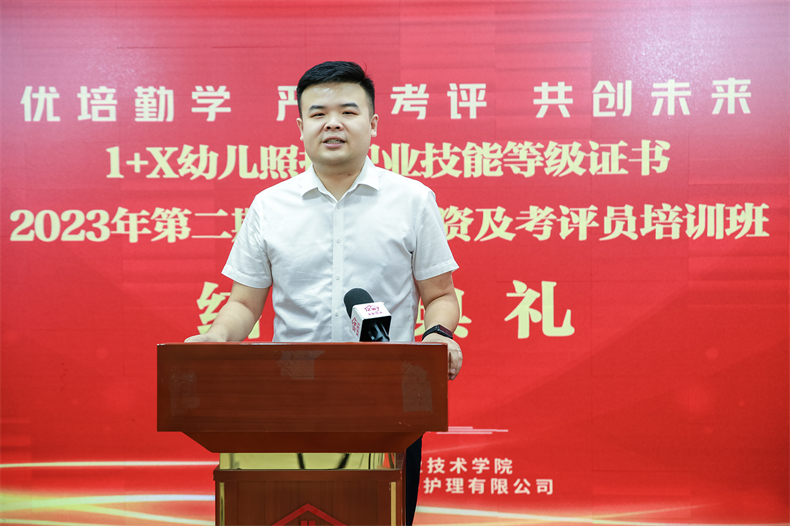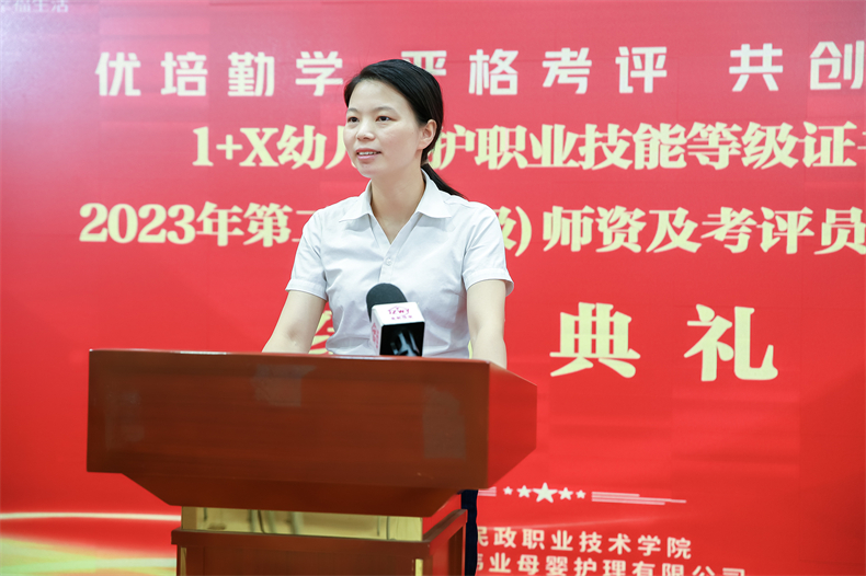 結業典禮伊始,金職偉業總經理助理湯曌宇以“感謝、展望、落地”為題做分享,“希望各位專家、老師們把培訓期間的所見、所聞、所學、所想帶進課堂,并真正付諸于實踐,積極推動嬰幼兒照護事業的實施落地,成為1+X幼兒照護證書的傳播者,職教改革路上的貢獻者。”
