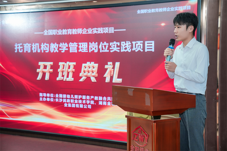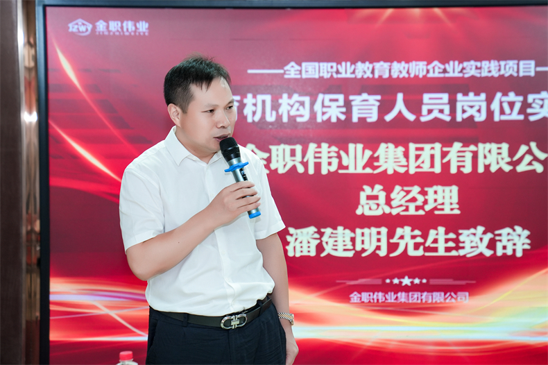 典禮伊始,金職偉業總經理潘建明對所有參訓老師的積極支持表示感謝與熱烈歡迎。他提到,金職偉業始終以結果為導向開展工作,致力于做好標準、做好規范,發揮好職業教育教師企業實踐基地引領示范作用。“在此次托育機構教學與管理崗位實踐項目中,金職偉業立足職業教育與行業崗位需求,課程設置既有學有做,也有總結與分析,希望各位參訓教師能扎實學習體驗,將此次實踐成果落地實際,為行業培養更多高素質、高技能的應用型人才。”