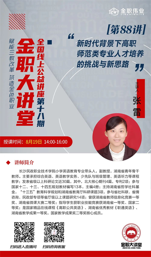 8月19日,金職大講堂將開啟第十八期第88講,課程將邀請長沙民政職業技術學院張雷教授,進行《新時代背景下高職師范類專業人才培養的挑戰與新思路》主題授課。屆時,誠邀各位行業專家、院校老師共同參與。