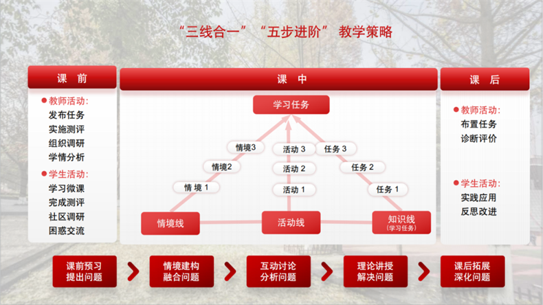 關于教學能力比賽的備賽策略,他提到,一支優秀的團隊是獲勝的關鍵因素,比賽前應該組建結構性教學團隊,開展針對性學情分析,因材施教;其次,選擇熱點性授課專題,制定“三線合一”“五步進階”的突破性教學策略,撰寫科學性教學設計,探索實踐性教學經驗,打造“行走的思政課”;最后,實施多樣性教學評價與形成診斷性教學報告。“整個教學能力比賽中,不管是課堂教學還是實踐教學,要做到:做得真實,材料真實,過程真實,教師真實,任務真實,講得真實,學生真實,環境真實,學得真實。”